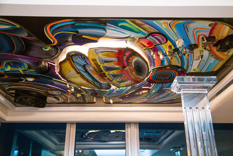 ST.3FENIX rises above the viewer as an artificial firmament, a suspended field of mineral matter, color, and light. Measuring 3 by 3 meters and installed overhead, the work transforms the exhibition space into an immersive environment, drawing the audience into an upward gaze that activates the entire spatial field.